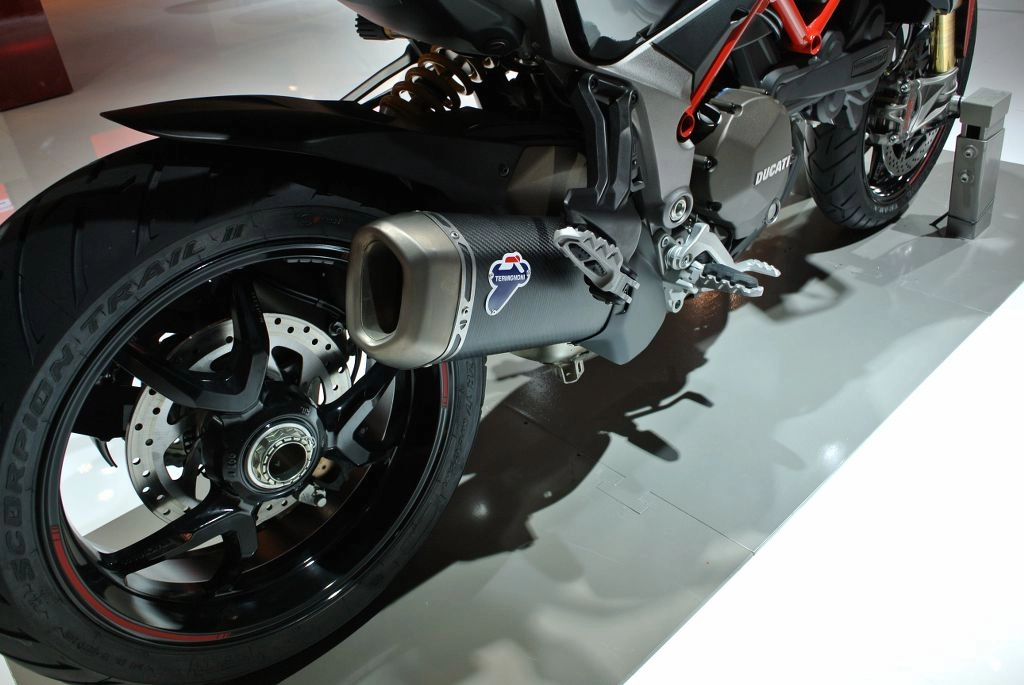 La più sportiva della gamma Multistrada monta scarico Termignoni omologato in fibra di carbonio, sospensioni Ohlins e nuova livrea a tre colori (bianco, rosso e nero con il telaio rosso a contrasto).