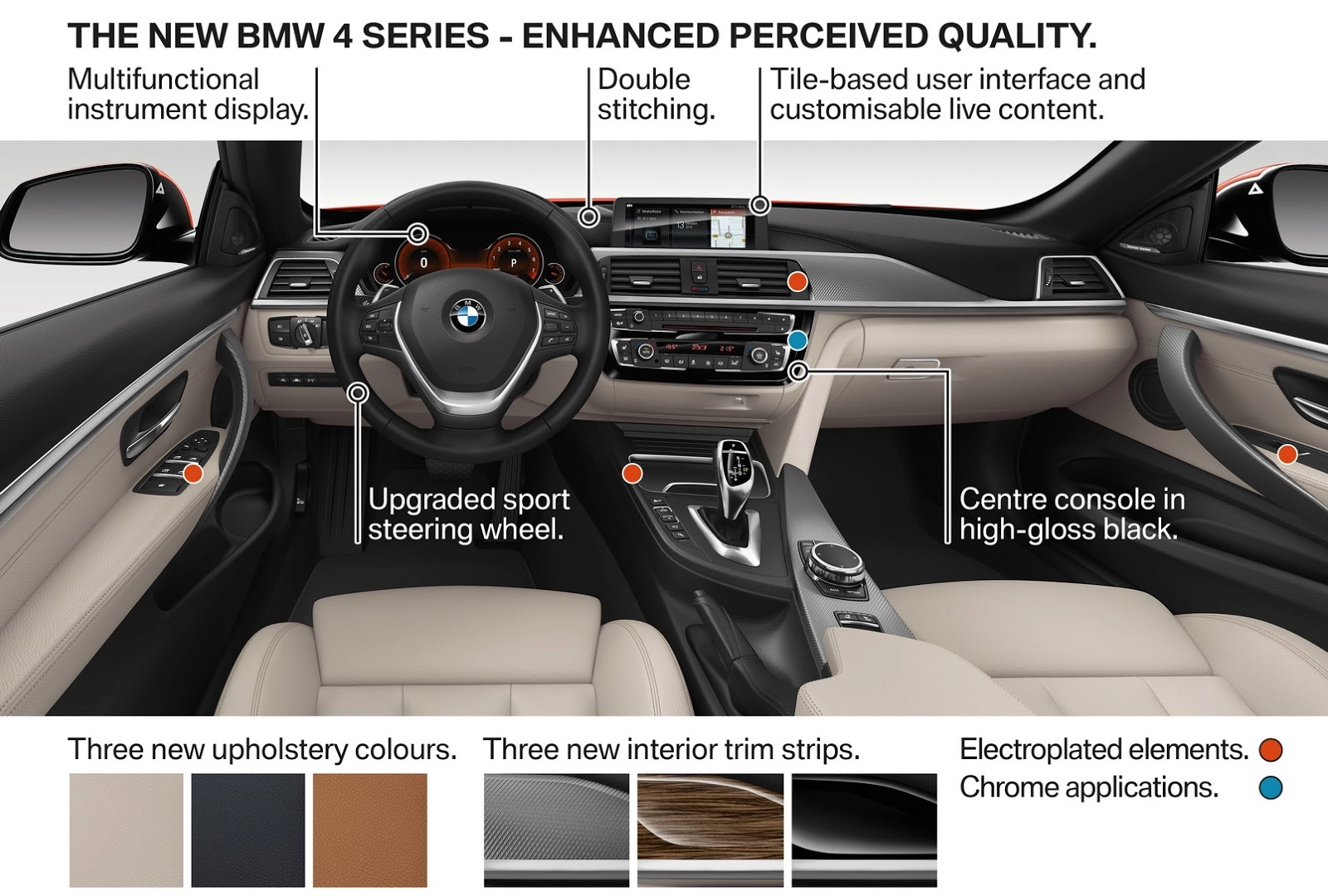 Come sulla Serie 3, a livello estetico cambia la grafica interna dei gruppi ottici, molto simili a quelli della Serie 4 Concept del 2012. Di serie per tutte le Serie 4 ci saranno i fari e i fendibebbia full-LED, mentre come gli adattivi anteriori saranno optional. Nuovi sono anche i paraurti e gli inserti, che variano a seconda degli allestimenti scelti, insieme alle due vernici Snapper Rocks Blue e Sunset Orange e a quattro nuovi disegni per i cerchi in lega.