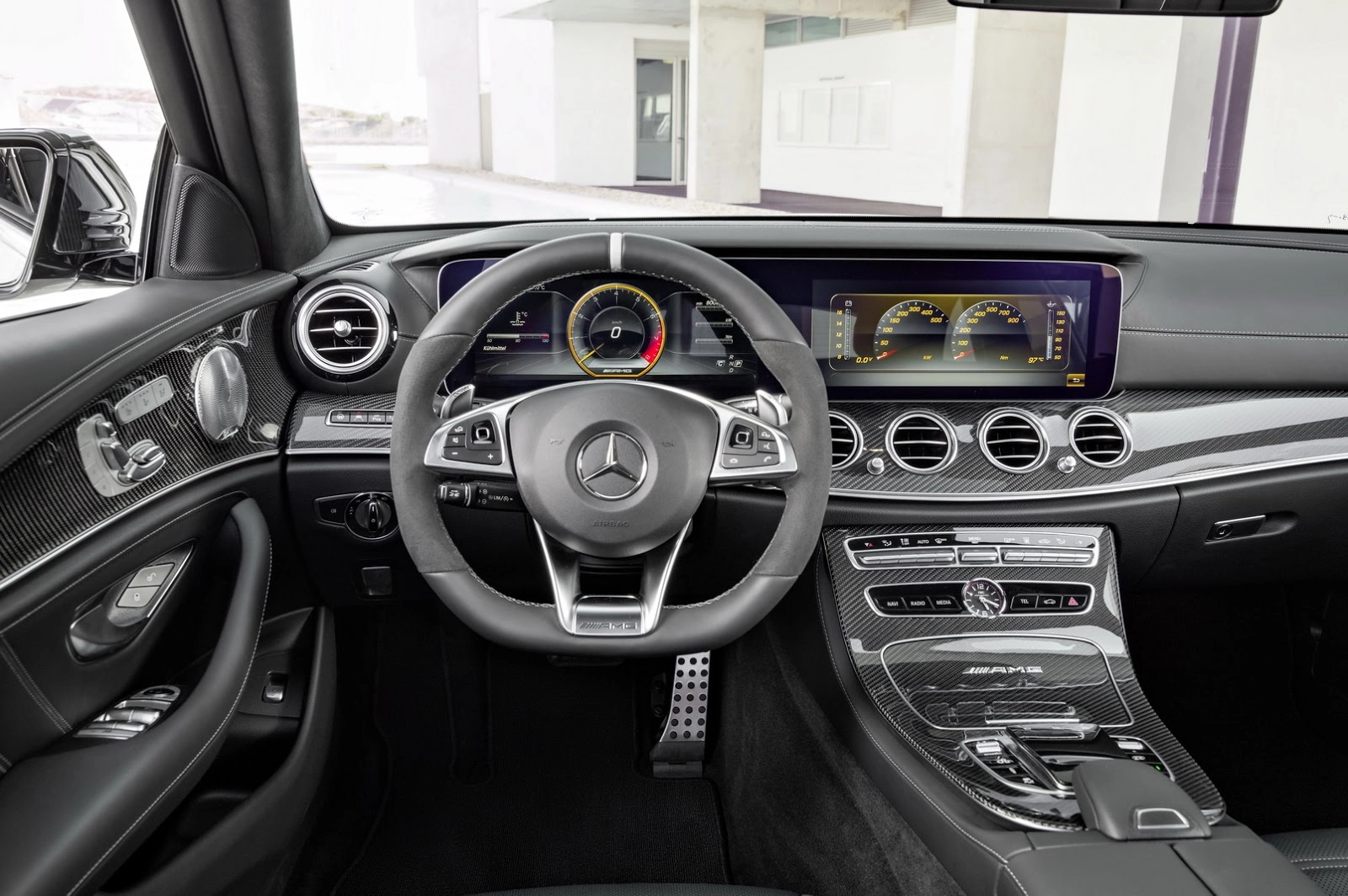 Natualmente non mancano gli accorgimenti estetici: la E 63 è più larga di 2,7 centrimetri rispetto alla Station Wagon di partenza e questo si nota nel rigonfiamento dei parafanghi anteriori e posteriori. Cambia la forma del cofano anteriore, il paraurti diventa più prominente accogliendo appendici in fibra di carbonio e sulla fiancata si nota un inserto in corrispondenza dello sfogo d’aria laterale. Dentro, infine, il lusso di Mercedes Classe E si fonde con tessuti tecnici e dettagli racing (anche nella strumentazione digitale), in puro stile AMG.