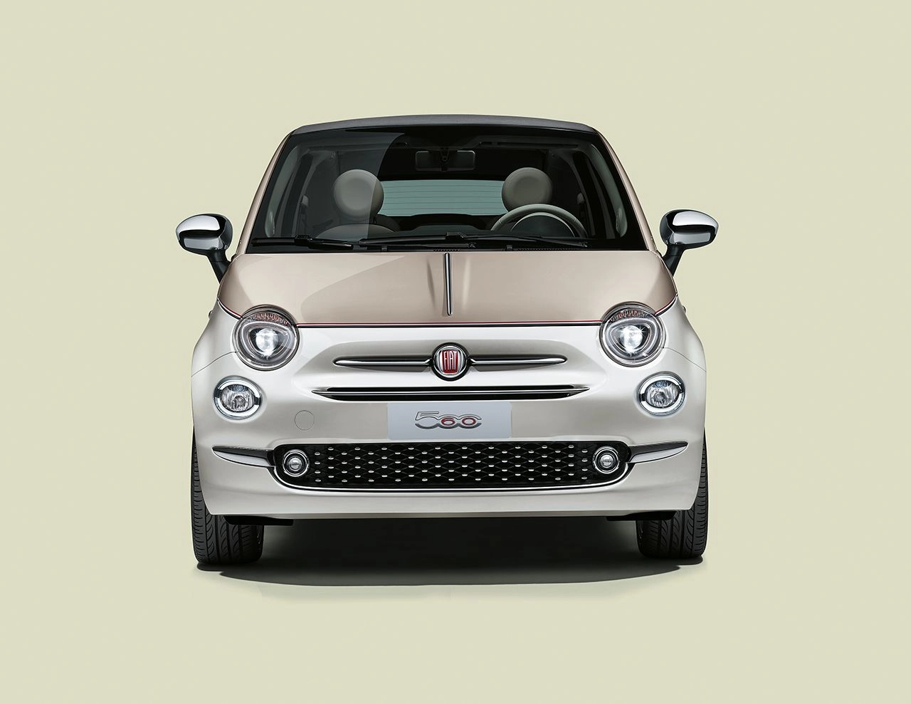 Realizzata esclusivamente in versione cabrio, Fiat 500 serie speciale dedicata al 60esimo anniversariopresenta un’inedita verniciatura bicolore dall’evocativo nome Dolcevita: Bianco Tristrato per il corpo della vettura, Avorio pastello per il cofano e i montanti. La linea di cintura, grigia e bordeaux, esalta questo abbinamento cromatico, mentre il colore scelto per la capote è il grigio. A rimarcare la raffinatezza di questa serie speciale i numerosi dettagli estetici quali le calotte cromate degli specchietti retrovisori esterni, i cerchi in lega leggera specifici da 16" e un logo dedicato, 560, che diventa un vero e proprio “marchio nel marchio" con il “6" e lo “0", rossi, racchiusi nelle ultime due cifre del logo 500.
