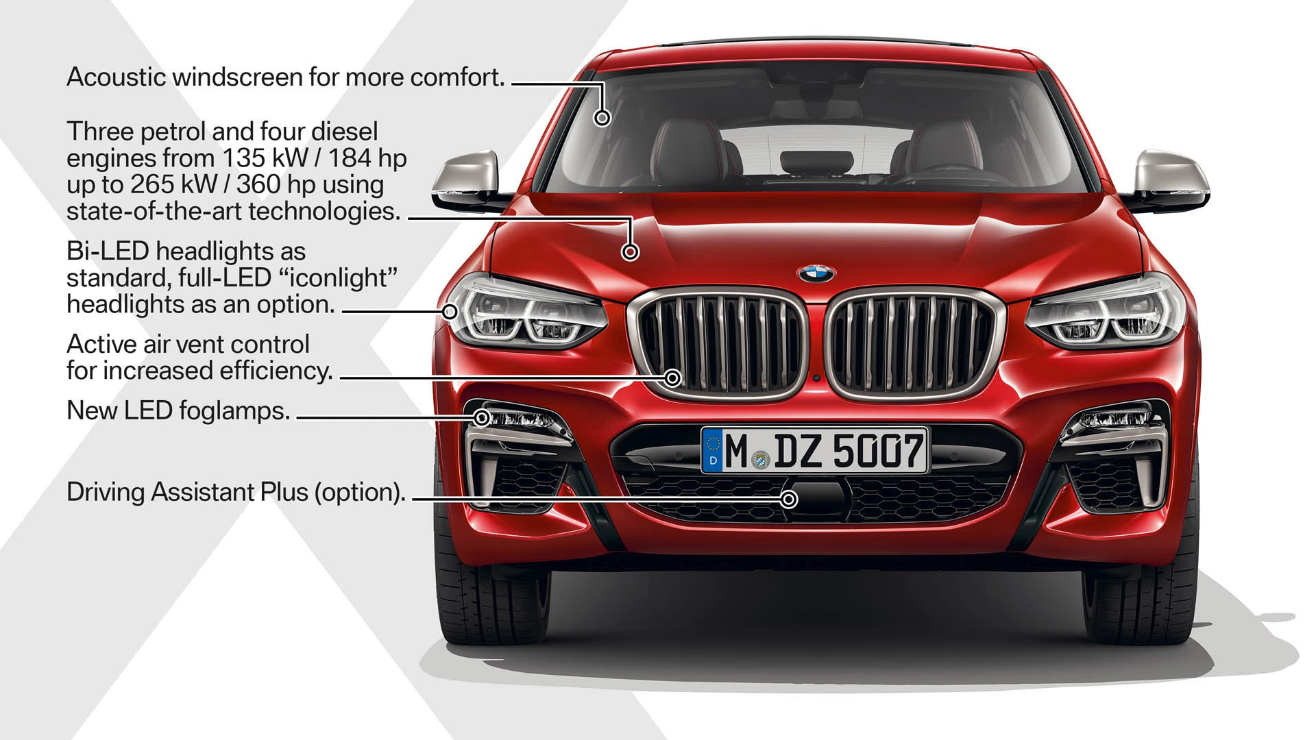 Se davanti non ci sono modifiche sostanziali rispetto al modello di derivazione (caratterizzato da fari e calandra di grandi dimensioni e paraurti elaborati), nel posteriore possiamo apprezzare il lavoro dei designer del marchio nel differenziare X4 da X3, introducendo una serie di stilemi che saranno comuni a tutte le sportive BMW, a cominciare dalle nuove Z4 e Serie 8, in arrivo nel corso del 2018. Un terzo volume accennato, fari a LED con la caratteristica firma luminosa tridimensionale a "L" e targa spostata in basso, nel paraurti: queste le cifre di un codice stilistico ben definito, destinato a creare family feeling. Interessante il trattamento delle superfici laterali, con due nervature che si intersecano in corrispondenza del parafango posteriore.
