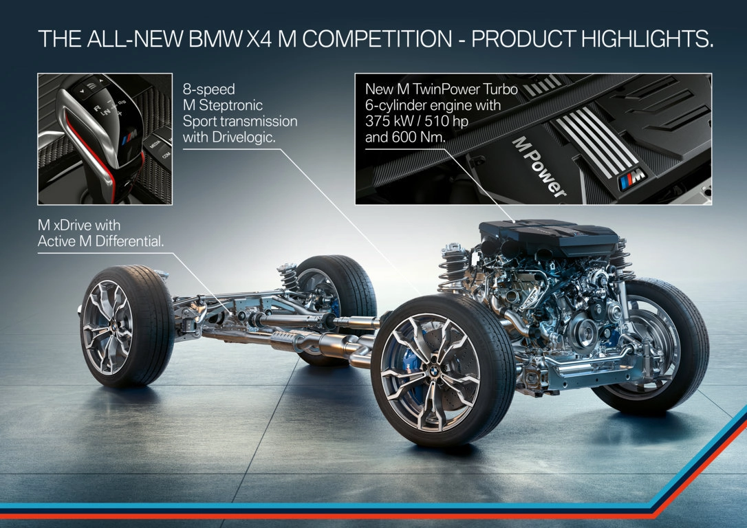 Sotto al cofano di BMW X3 M e X4 M scalpita il 3.0 6 cilindri in linea M TwinPower Turbo da 480 CV e 600 Nm di coppia massima, un motore che vedremo con buone probabilità anche sulla prossima generazione di BMW M3 e M4. Lo 0-100 è coperto in 4,2 secondi. La trasmissione è automatica a 8 rapporti (M Steptronic), mentre la trazione è integrale (la stessa M xDrive che ha debuttato lo scorso anno su BMW M5), anche se di norma la vettura viene spinta dalle ruote posteriori. Presente il differenziale Active M, pensato per agevolare la distribuzione della coppia tra i due assi e migliorare l'agilità e la direzionalità dei crossover.