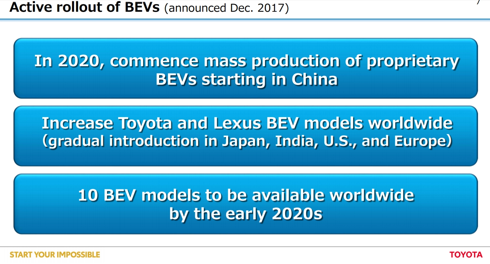 A partire dal 2020, la gamma Toyota introdurrà una nuova piattaforma modulare per auto elettriche – la e-TNGA – che in quello stesso anno darà vita a 6 nuovi modelli, tra crossover, SUV, veicoli MPV e altri, tutti destinati al mercato globale e dotati di tecnologie avanzate anche per quanto riguarda le batterie. In totale, nella prima fase dell'offensiva, saranno 10 i nuovi modelli elettrici, mentre, come già sappiamo, entro il 2025 tutti i modelli della gamma avranno una versione elettrificata (che sia elettrica o ibrida).