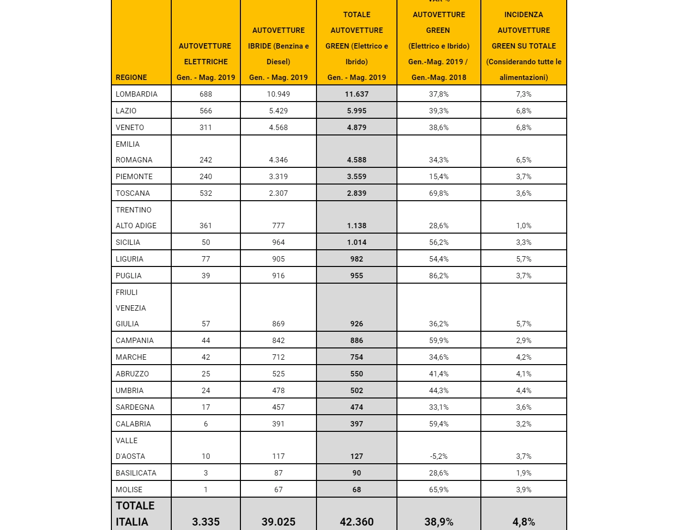 Auto elettriche e ibride in Italia continuano a crescere a doppia cifra, con numeri che variano da regione a regione sebbene la quota complessiva resti marginale. L'analisi del Centro Studi di AutoScout24 su base dati ACI mostra una situazione, nei primi cinque mesi del 2019, dove le elettriche hanno una quota dello 0,4% e le ibride raggiungono il 4,8%.