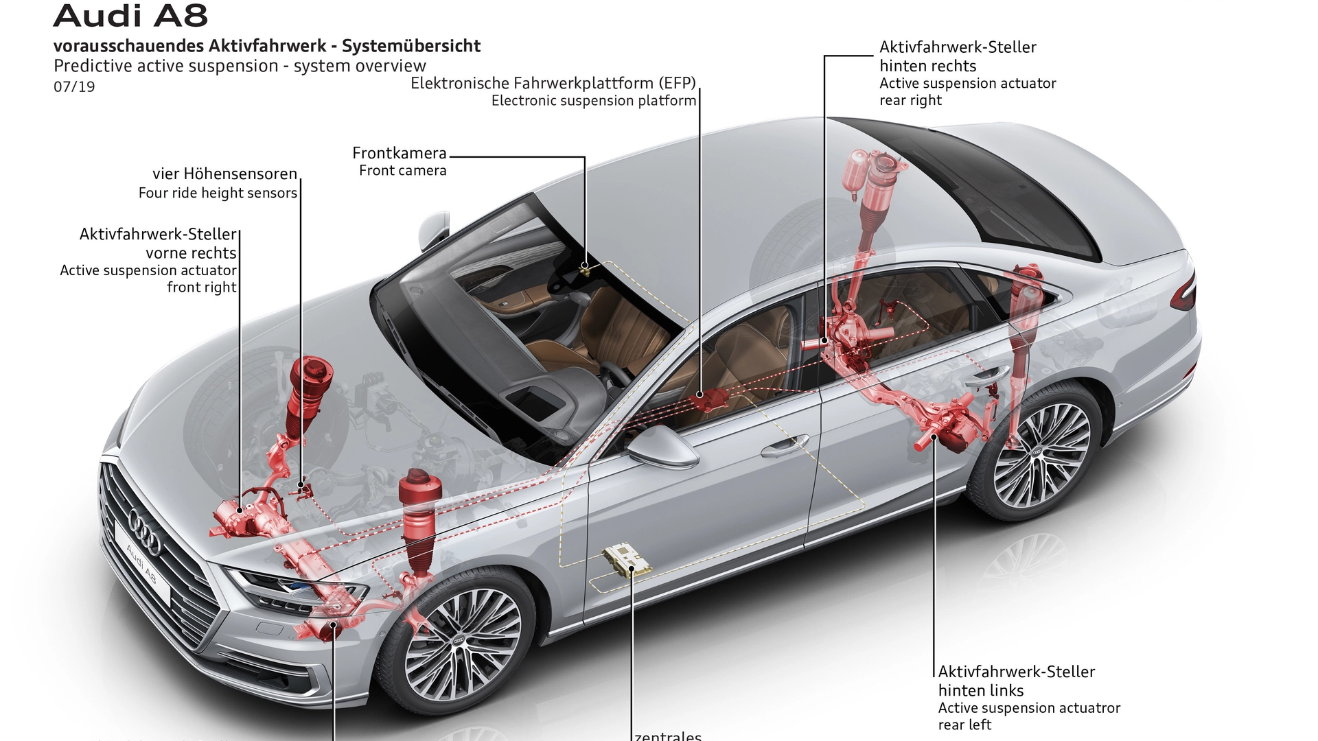 Infine, ogni volta che si apre una portiera, l'auto si alza rapidamente di 50 mm per consentire ai passeggeri di salire o scendere più comodamente. Audi predictive active suspension sarà disponibile da agosto 2019 su Audi A8, inizialmente solo sulle versioni a benzina TFSI, ad un prezzo di 5.450 euro in Germania.