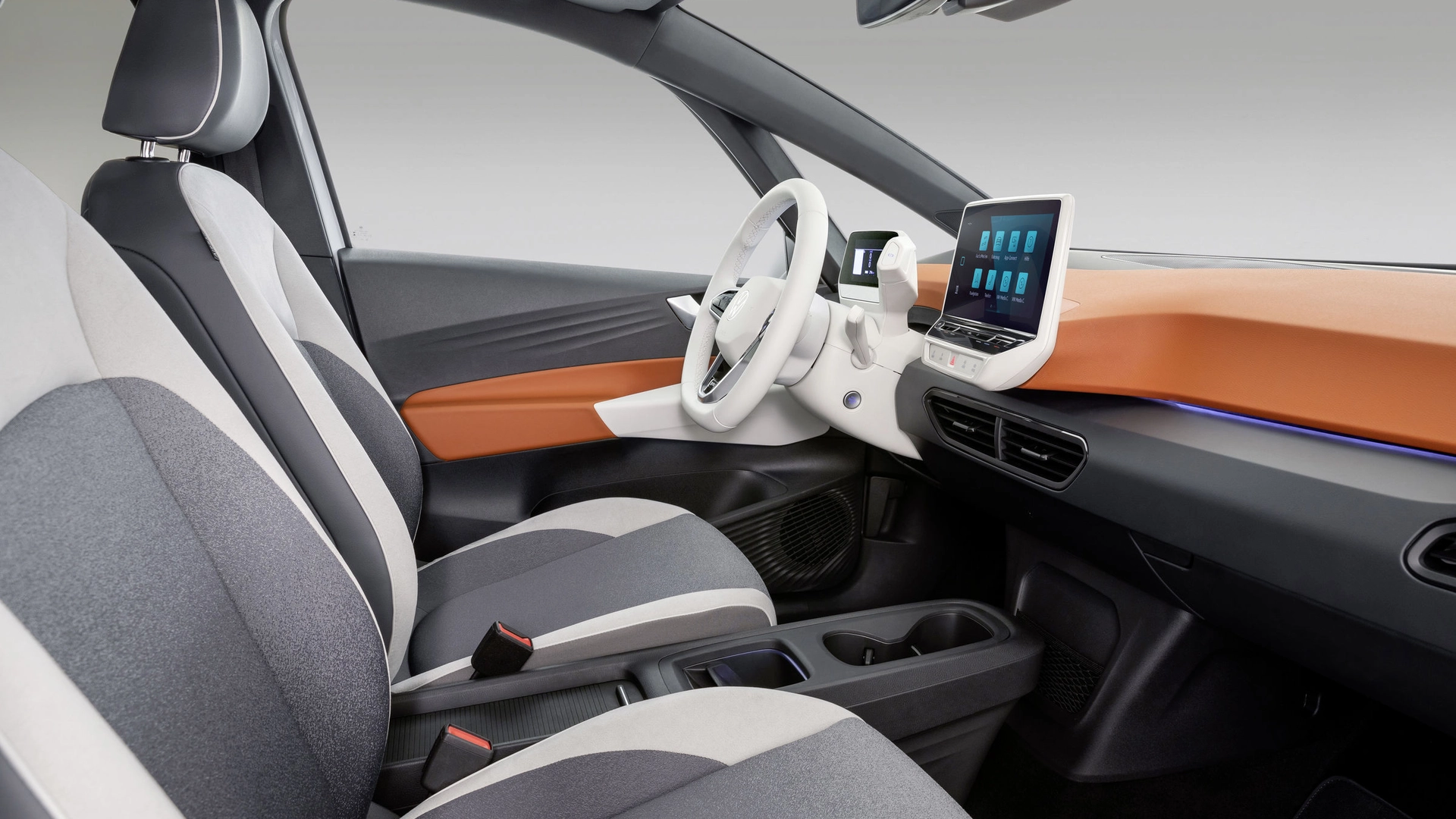 Non ci sono tasti fisici (ad eccezione dei comandi degli alzacristalli e dell'hazard): tutto si gestisce dal display o dalla pulsantiera a sfioramento alla sua base (con quattro scorciatoie per richiamare le principali funzioni della vettura). Il cambio – o meglio – la selezione della modalità avanti, retro e parcheggio – si gestisce da una sorta di manopola posizionata alla destra della strumentazione. Presente la ID. Light, una striscia luminosa a LED che, accendendosi, supporta il conducente durante la guida intervenendo, per esempio, per spingerlo a frenare in caso di emergenza.