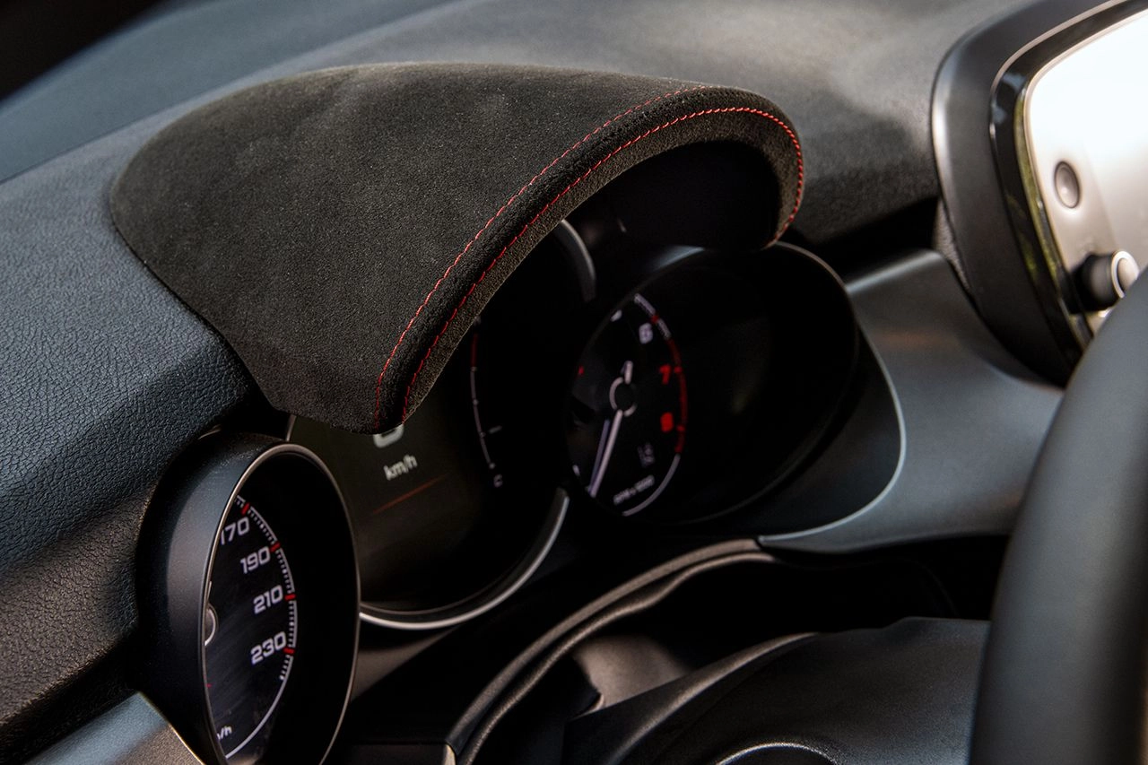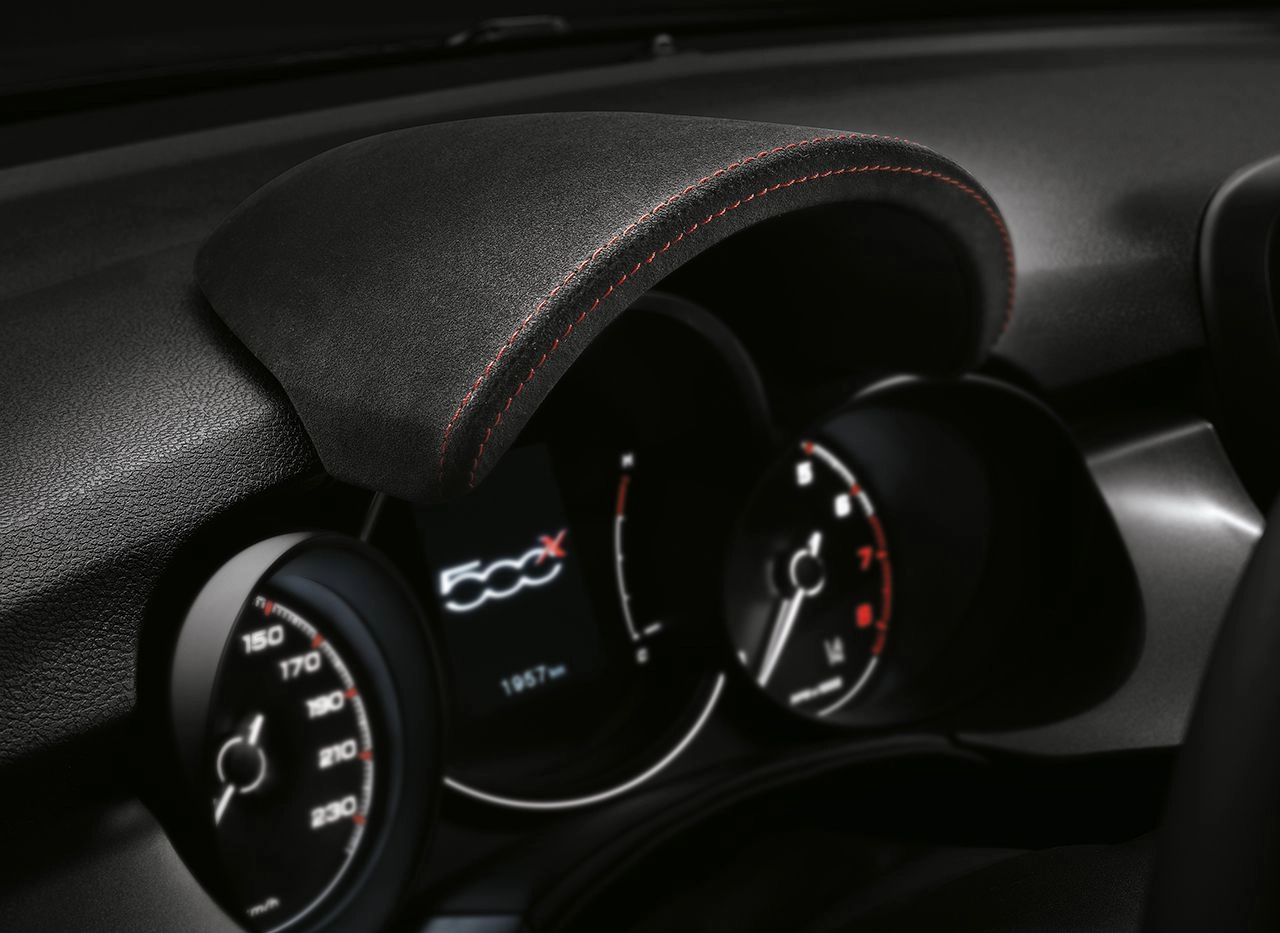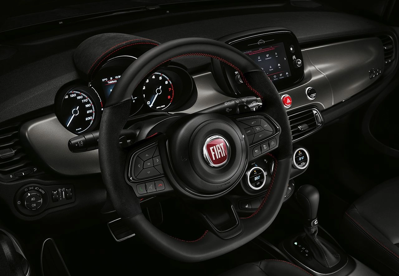 Optional il rivestimento in Alcantara (con cuciture a contrasto rosse) per il volante con sagoma sportiva e la copertura del quadro strumenti. Nuovi anche i sedili in tessuto nero con inserti in vinile e logo grigio "500", la lunetta in vinile nero e le cuciture specifiche in grigio/rosso (optional il rivestimento dei sedili in pelle nera con finiture in grigio titanio, oltre alla pedaliera sportiva in alluminio e ai tappetini anteriori con cuciture specifiche).