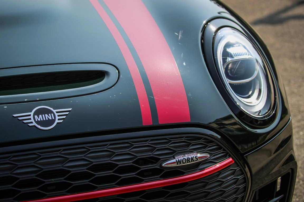 Rispetto alle versioni Cooper S e SD, JCW si distingue immediatamente per alcune peculiarità estetiche: i dettagli rossi, tipici degli allestimenti John Cooper Works, si trovano sul tetto e sulle calotte degli specchietti retrovisori. Design dedicato anche per i Side Scuttles laterali (che integrano gli indicatori di direzione) e il logo John Cooper Works sulla griglia del radiatore e sul portellone posteriore. Le prese d'aria anteriori sono vere (ad eccezione di quella sul cofano, che resta finta anche qui), così come gli sfoghi dell'aria laterali, appena dietro il passaruota anteriore, e l'impianto frenante con dischi maggiorati e pinze monoblocco.
