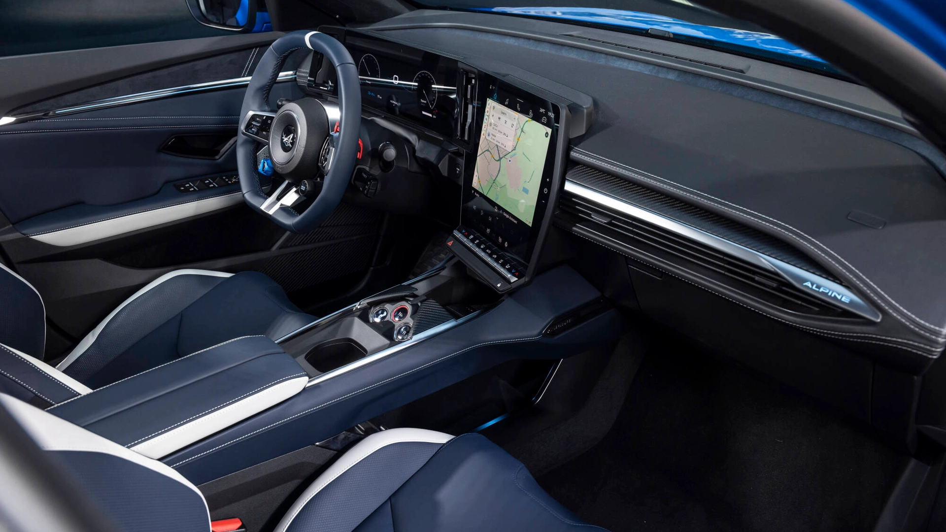 Sul volante, troviamo due specifici pulsanti colorati in alluminio, ispirati al mondo della Formula 1, regolano il livello di rigenerazione della frenata (pulsante rotante blu RCH per Recharge) fino alla modalità One Pedal, la potenza extra utilizzata per i sorpassi e il launch control (pulsante rosso OV per Overtake). Nuova Alpine A390 è dotata di sedili sportivi Alpine Sport Seat regolabili elettricamente e riscaldati per garantire comfort e sostegno, rivestiti da diversi tipi di materiali, tra cui la microfibra di Alcantara. Al top della gamma, A390 è dotata di sedili da corsa in pelle Nappa blu e grigia Alpine Sport Seat by Sabelt.