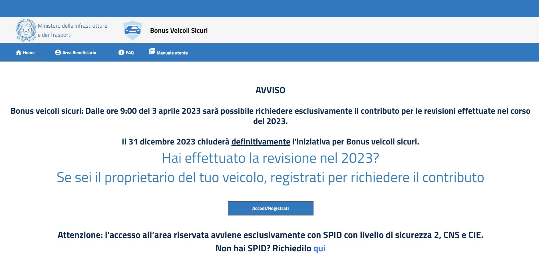 Gli interessati a richiedere questo contributo per la revisione auto, dovranno recarsi sul sito Bonus Veicoli Sicuri. Per accedere alla piattaforma sarà necessario utilizzare lo SPID oppure la Carta d’identità elettronica (CIE) o la Carta nazionale dei servizi (CNS). Una volta effettuato l'accesso, sarà sufficiente inserire alcune informazioni come il numero della targa della vettura, il numero della patente, il giorno in cui è stata effettuata la revisione e il codice IBAN del conto corrente su cui dovrà essere effettuato il versamento dei 9,95 euro.