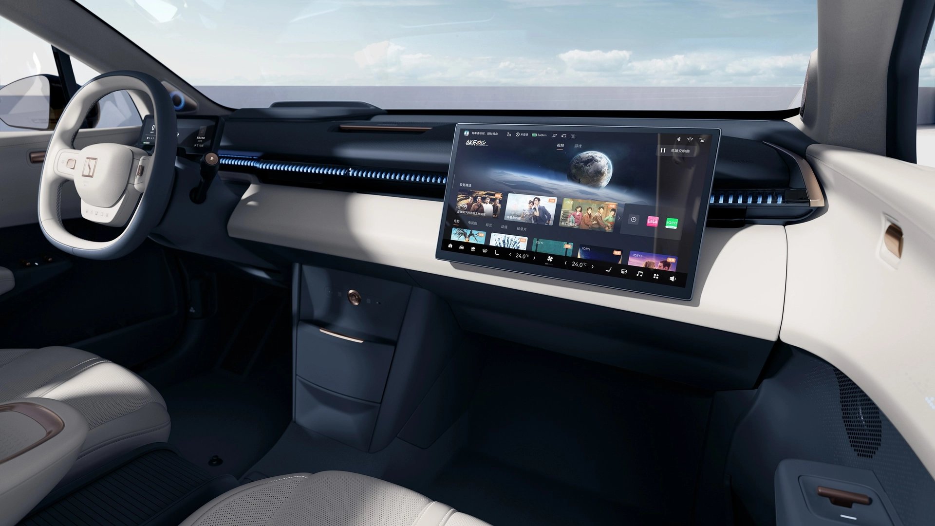 L'abitacolo presenta un look minimalista. Ovviamente, non manca tanta tecnologia. Dietro al volante troviamo uno schermo da 8,8 pollici che mostra le principali informazioni di marcia. Centralmente, invece, è presente un ampio display touch da 14,6 pollici del sistema infotainment vero e proprio che può scorrere per spostarsi sul lato del passeggero. Quando viene spostato sulla destra, per essere utilizzato dal passeggero, il display permette di accedere esclusivamente alle funzioni legate all'intrattenimento. Parte della dotazione anche un Head-Up Display.