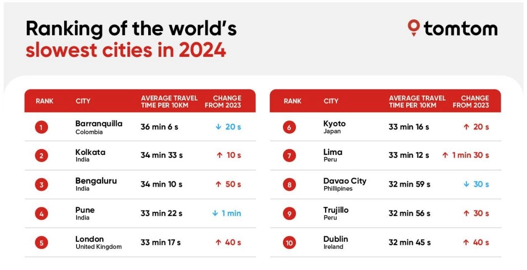 Secondo il rapporto, nel 2024, 379 città su 500 (76%) hanno visto la loro velocità media complessiva diminuire rispetto al 2023. Nonostante questo calo, le velocità medie in condizioni ottimali, caratterizzate da traffico scorrevole, sono rimaste stabili e hanno persino mostrato lievi miglioramenti nella maggior parte delle città.