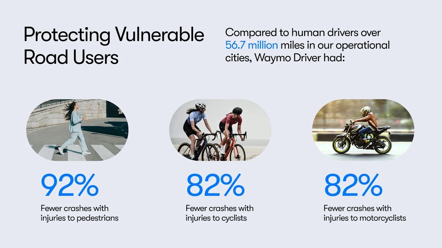 Secondo lo studio, le vetture a guida autonoma di Waymo hanno avuto interazioni più sicure con gli utenti vulnerabili della strada con sostanziali riduzioni degli incidenti con feriti tra pedoni (riduzione del 92%), ciclisti (riduzione dell'82%) e motociclisti (riduzione dell'82%). Un ulteriore miglioramento è stato rilevato agli incroci con una riduzione degli incidenti con lesione del 96%. Questa riduzione, spiega l'azienda, può essere attribuita in gran parte alla capacità del sistema Waymo Driver di rilevare e reagire in modo appropriato ai veicoli che passano con il semaforo rosso.
