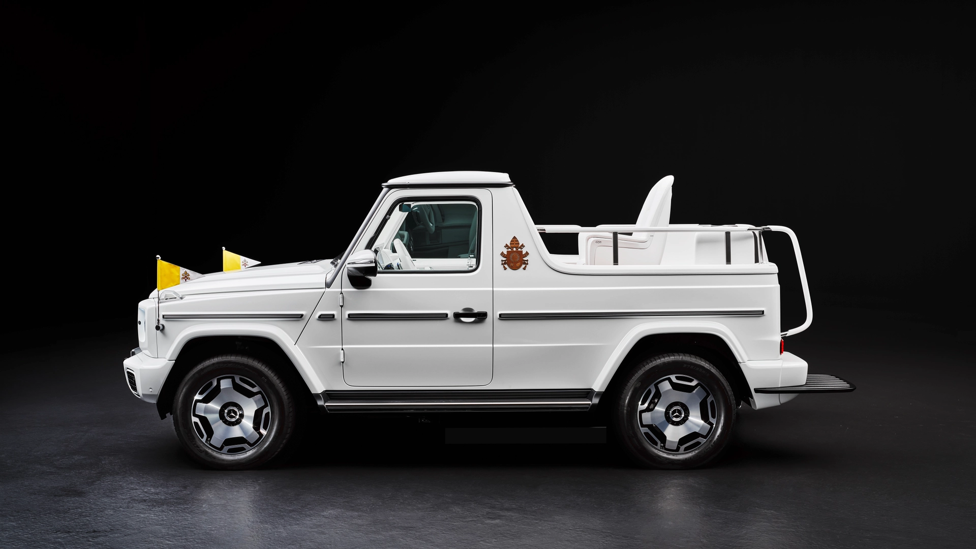 Esemplare unico, rifinito e personalizzato a mano. La base è quella della G580 elettrica, un fuoristrada dotato di ben 4 motori e quindi può contare anche sulla trazione integrale. Le specifiche del modello parlano di ben 432 kW e 1.164 Nm di coppia. Il tutto è poi alimentato da una batteria con una capacità di 116 kWh. Ovviamente, il fuoristrada è stato ampiamente personalizzato per diventare una Papamobile.