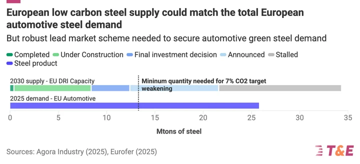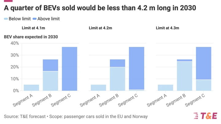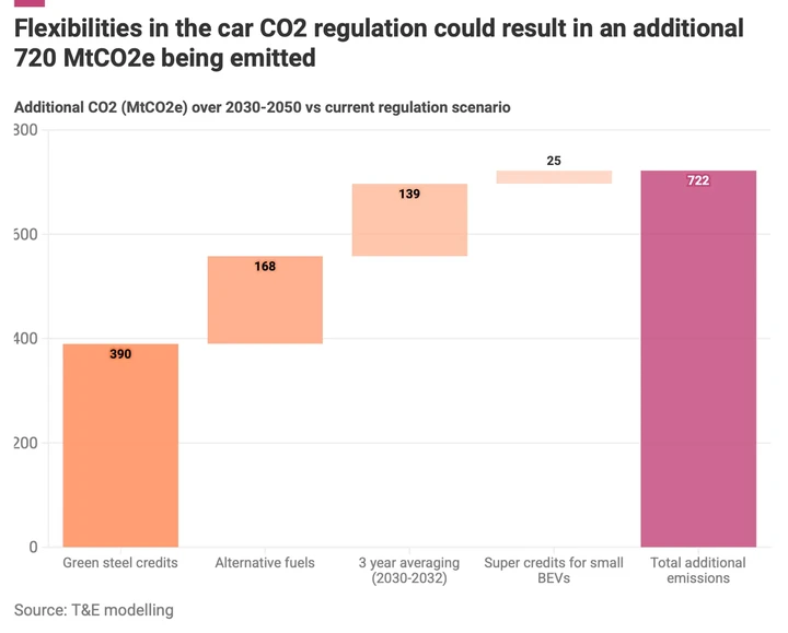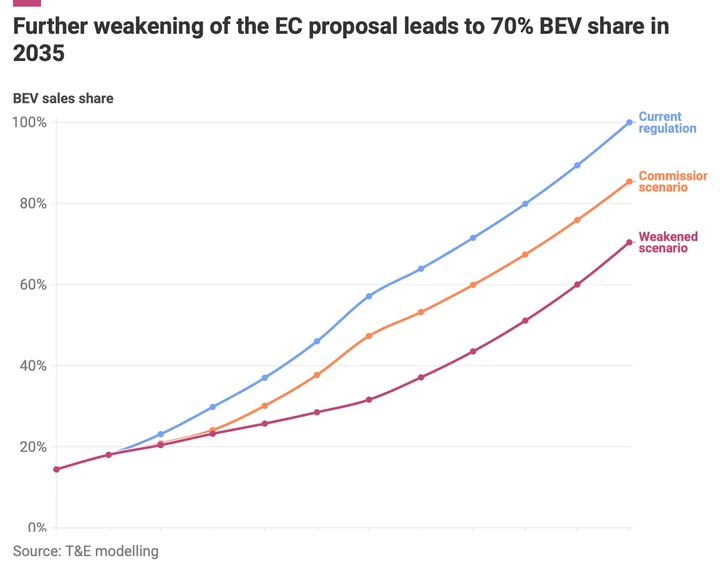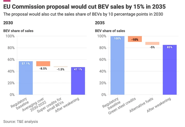 La Commissione a dicembre ha proposto di rivedere l’obiettivo del 2035 fissando un obiettivo di riduzione delle emissioni del 90% rispetto al 2021, anziché del 100%. Il restante 10% di emissioni dovrà essere “compensato" da combustibili alternativi (fino al 3%) e acciaio a basse emissioni di carbonio (fino al 7%), consentendo alle case automobilistiche di poter vendere qualsiasi propulsore dopo il 2035, compresi quelli a combustione interna e ibridi. Secondo l’associazione, questa modifica porterà le vendite di veicoli elettrici all’85% nel 2035, anziché al 100%.