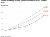 Alla fine, la quota precisa di veicoli elettrici nel 2035 varierà a seconda del mix di veicoli a combustione interna di ciascuna casa automobilistica. L’obiettivo di riduzione del 90% di CO2 implica che, in media, le emissioni della flotta delle case automobilistiche dovranno rimanere al di sotto di 11 g CO2/km nel 2035. Dopo, per le case automobilistiche sarà possibile vendere qualsiasi tipo di propulsore, inclusi benzina, diesel, ibridi, ibridi plug-in e con range extender. A seconda del mix di vendita, le case automobilistiche potrebbero vendere tra il 5% e il 50% di veicoli non BEV dopo il 2035, inclusi veicoli ibridi plug-in, altri ibridi e veicoli a combustione convenzionale.