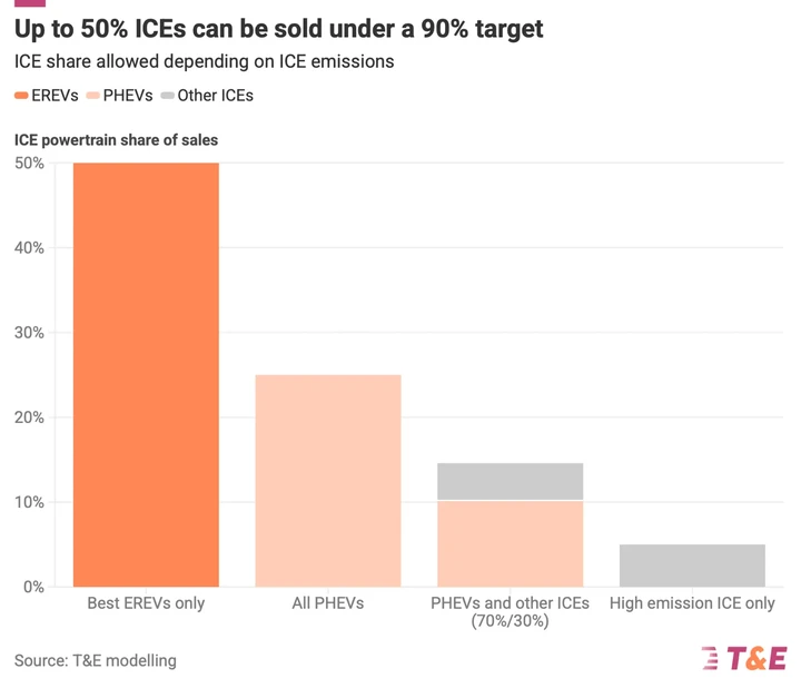 La quota di queste auto a combustione dipenderà dalle loro emissioni medie di CO2. Con veicoli ibridi plug-in a autonomia estesa (EREV) più efficienti, con 22 g/km, la quota raggiungerà il 50%; tuttavia, questa cifra scenderebbe al 25% se venissero venduti invece veicoli ibridi plug-in (PHEV), che emettono 45 g/km. Nello scenario più realistico, l’associazione ipotizza che il 10% dei veicoli venduti sarà costituito da veicoli ibridi plug-in e circa il 5% da veicoli a combustione interna.