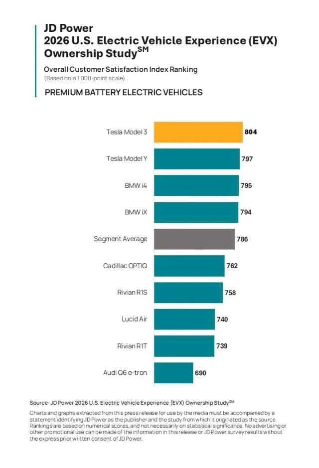 Insomma, chi acquista elettrico è soddisfatto e non tornerebbe più indietro. L’analisi prosegue e si focalizza sulle auto. Da quanto emerge, la Tesla Model 3 è considerata l’auto elettrica più soddisfacente da possedere con un punteggio di 804. Primo posto anche nella categoria delle auto premium. La Tesla Model Y (797) si classifica al secondo posto e la BMW i4 (795) al terzo. La Ford Mustang Mach-E è prima nel segmento BEV per il mercato di massa con un punteggio di 760. La Hyundai IONIQ 6 (748) al secondo posto e la Kia EV9 (745) al terzo.