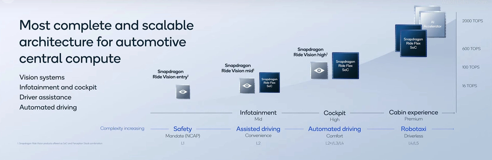 Qualcomm si posiziona con una risposta a tutte queste esigenze: la connettività 4G/5G, WiFi e Bluetooth è già integrata nelle piattaforme Snapdragon, inoltre il produttore offre una soluzione completa e modulare di ADAS in collaborazione con i diversi marchi, oltre ad abilitare la computer vision tramite videocamere, radar e lidar, e oltre a fornire una piattaforma per l'intelligenza artificiale che serve per le funzioni più evolute della guida autonoma.