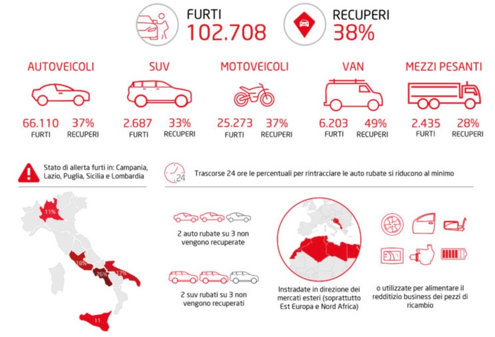 Pur avendo subìto una battuta d'arresto lo scorso anno, il fenomeno è stato comunque rilevante con 102.708 furti e il 38 per cento di vetture recuperate. Le autovetture rubate sono state 66.110. Due su tre non sono state recuperate. I veicoli rubati vengono destinati alla vendite nei mercati esteri – in particolare Est Europa e Nord Africa – o usati per alimentare il mercato dei pezzi di ricambio. Agire in fretta per cercare di ritrovare il veicolo è fondamentale, visto che si stima che, trascorse le prime 24 ore, le possibilità calano drasticamente.