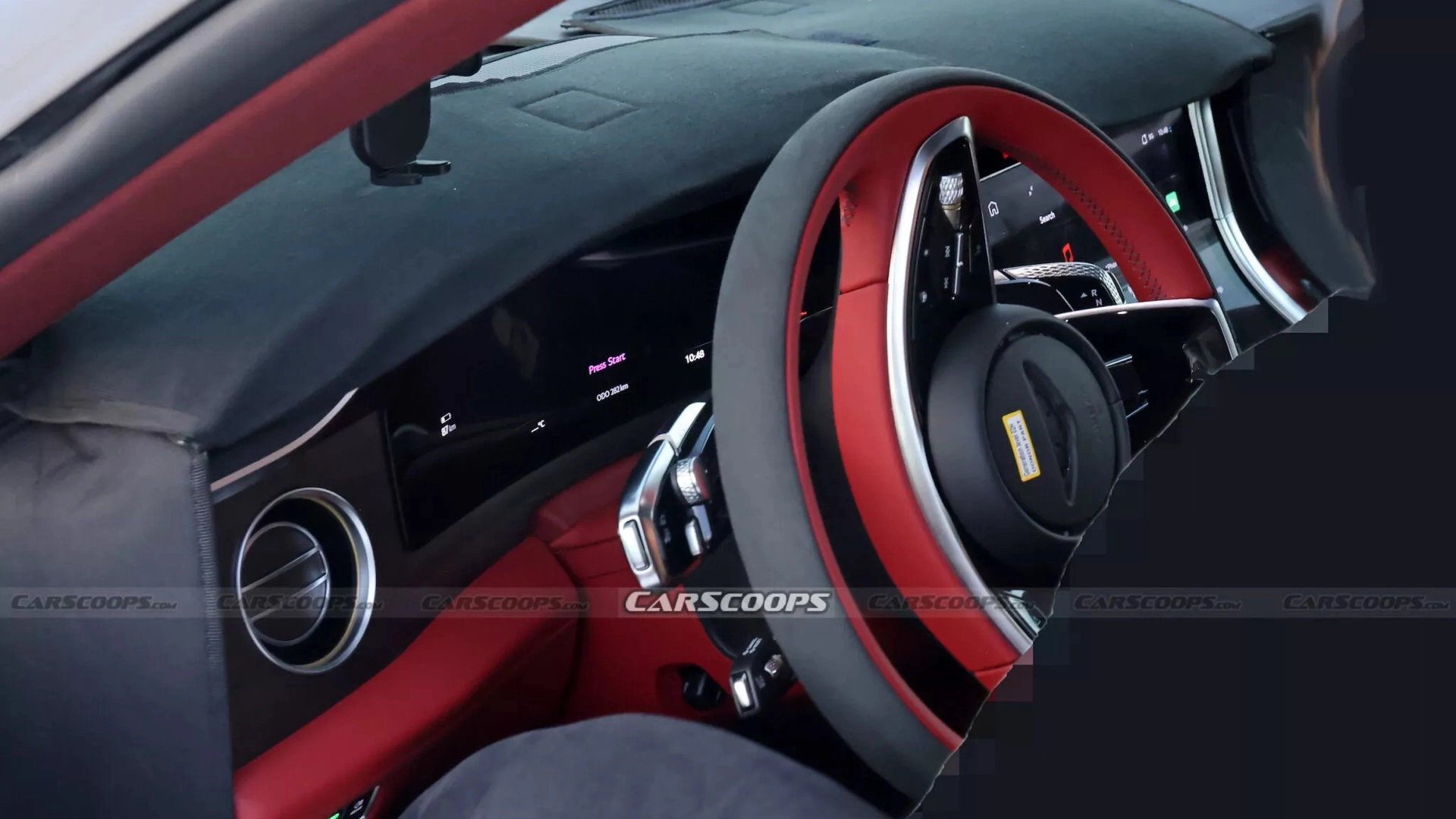 Dietro al volante c’è la strumentazione digitale, ma l’aspetto più interessante è l’ampio display verticale curvo del sistema infotainment. I rivestimenti e i materiali sono invece in perfetto stile Bentley. Sebbene la vettura sia ancora un prototipo si nota un mix di pelle e materiali premium per l’abitacolo.
