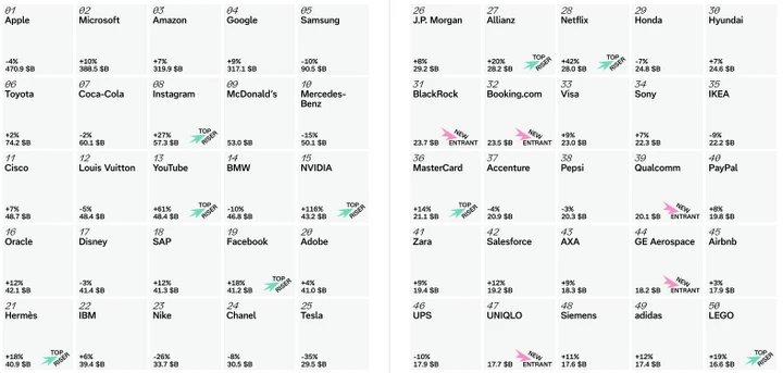 Prima apriamo una breve parentesi e vediamo come Interbrand calcola i valori dei marchi. La società di consulenza tiene conto principalmente di tre fattori: la performance finanziaria dei prodotti o servizi del marchio; il ruolo del marchio nel processo di acquisto; la forza competitiva del marchio, cioè la sua capacità di fidelizzare e sostenere domanda e margini nel lungo termine. Il valore attribuito ad ogni marchio è espresso i dollari. Ci sono poi anche altri elementi che concorrono a stilare questa classifica che, comunque, non corrisponde in alcun modo al valore di capitalizzazione in borsa.