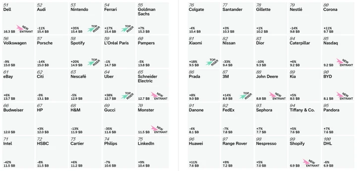 Parlando strettamente del settore automotive, nel rapporto si evidenziano le sfide che sta affrontando il mercato automotive in questa fase di transizione verso la mobilità elettrica. In ogni caso, le case automobilistiche continuano ad essere protagoniste di questa speciale classifica anche se in alcuni casi si sono registrati dei cali. Di Toyota abbiamo già detto che si trova al sesto posto. Al decimo c’è invece Mercedes anche se con un valore in calo del 15%. BMW la troviamo in posizione numero 14 anche lei con un calo del valore del 10%. In posizione numero 25 troviamo Tesla il cui valore del marchio è crollato addirittura del 35% a causa della crescente concorrenza nel segmento dei veicoli elettrici e delle problematiche che sta affrontando. Lo scorso anno in questa classifica si trovava al dodicesimo posto