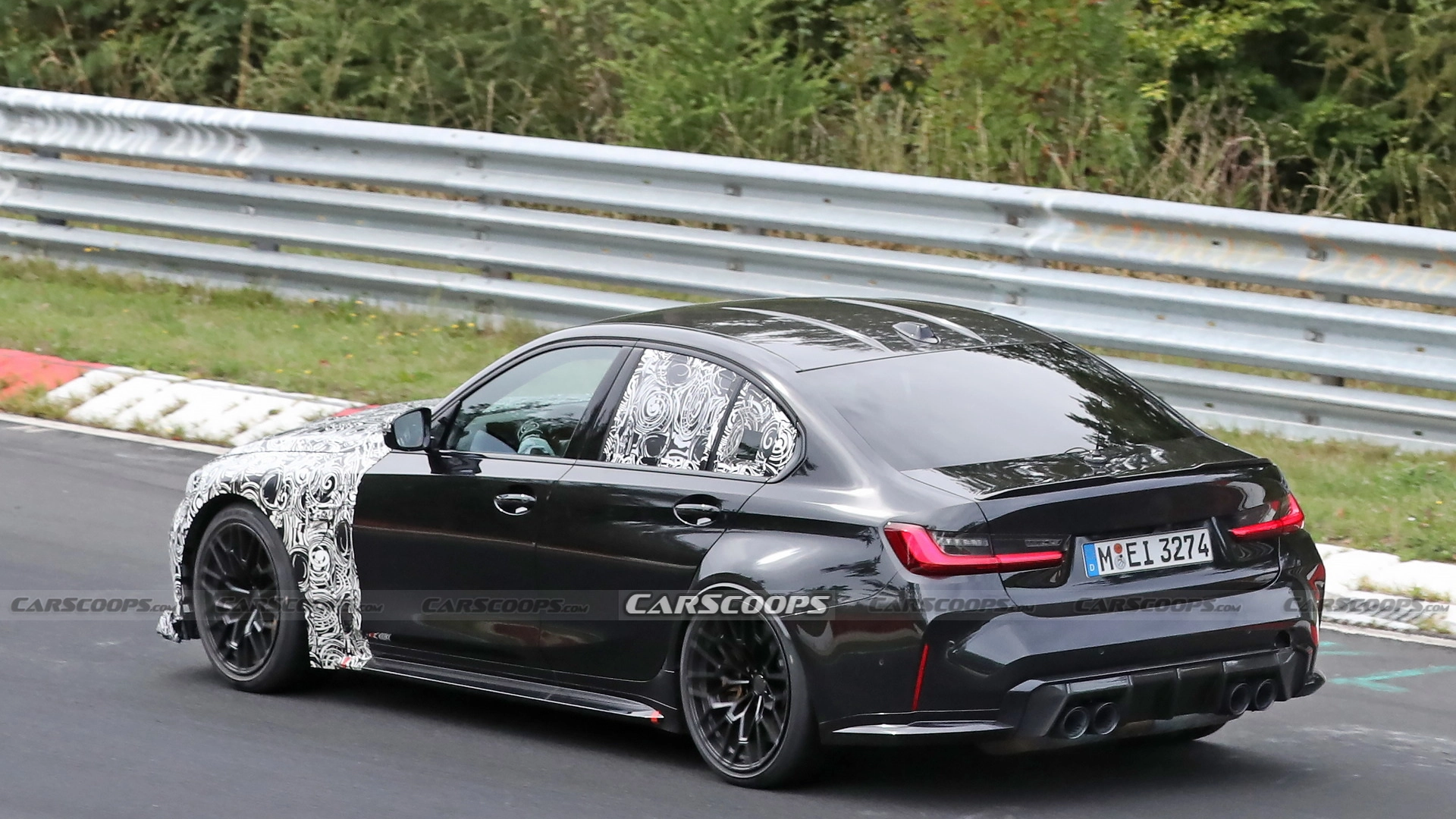 Non mancheranno nemmeno cerchi in lega dal nuovo design. Curiosamente, i finestrini delle portiere posteriori appaiono "oscurati" per evitare che si possa osservare all'interno della parte posteriore dell'abitacolo. Questo potrebbe far pensare che al posto della soluzione presente sulla M3 di serie, il marchio tedesco possa aver introdotto due sedili singoli monoscocca per arrivare a limitare il peso della vettura.