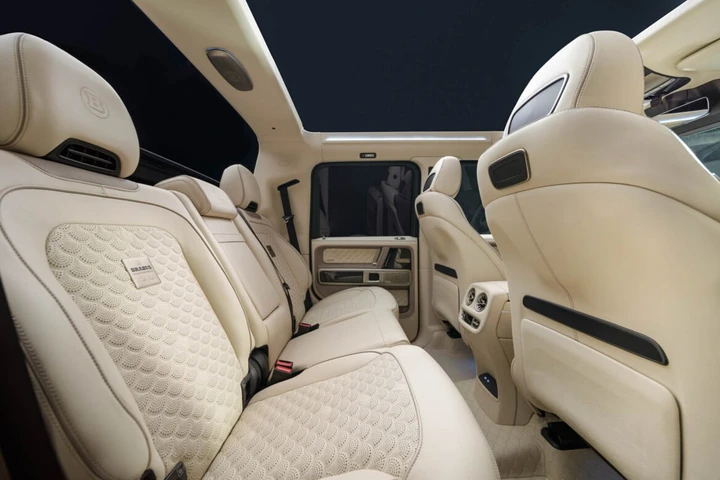 All’interno, la 800 CABRIO offre un abitacolo rifinito in pelle Oxford Sand e Cairos Brown. La lavorazione artigianale è visibile nella trapuntatura Shell, nelle superfici traforate dei sedili ventilati e nei loghi Brabus impressi a rilievo. I poggiatesta sono dotati di riscaldamento per il collo, soluzione pensata per favorire la guida a cielo aperto anche nelle mezze stagioni. Inserti in carbonio lucido, pedali in alluminio e cerniere Easy Entry per l’accesso ai posti posteriori completano un abitacolo degno di una vettura di alta gamma.