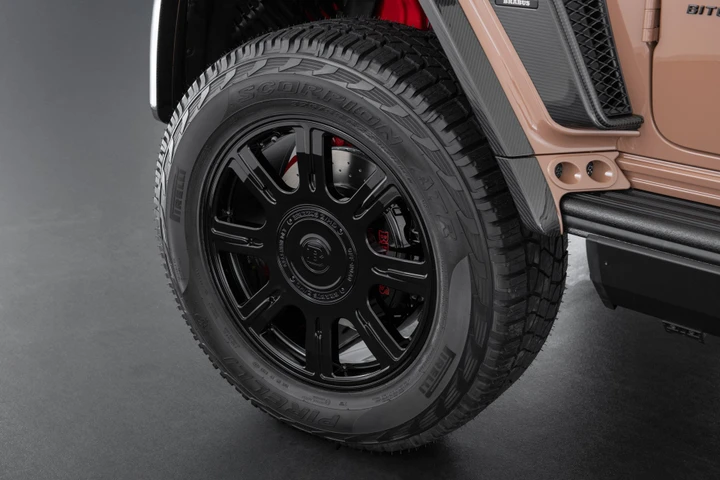 I cerchi da 22” Monoblock Z-HD sono pensati per ospitare pneumatici all-terrain da 325 millimetri e si inseriscono nei parafanghi WIDESTAR ancora più larghi. Le sospensioni sono gestite da un sistema Brabus Ride Control con possibilità di regolare altezza e rigidità direttamente dall’abitacolo. Il telaio, verniciato in rosso come la pelle interna, è stato sviluppato per sopportare le sollecitazioni più estreme grazie a sottotelai rinforzati e nuovi bracci sospensivi in alluminio ad alta resistenza.