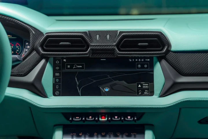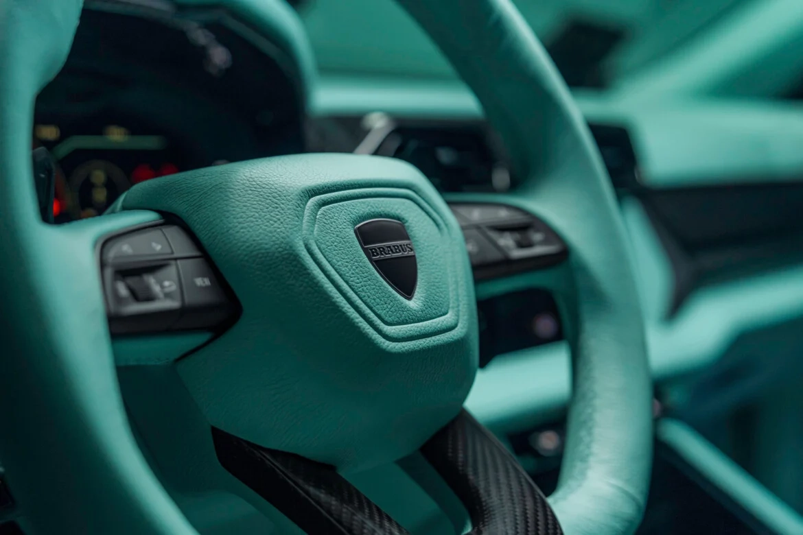 L’abitacolo prosegue la linea estetica dell’esterno e la traduce in un ambiente ancora più immersivo. La pelle Stone Mint riveste ogni superficie, dai sedili al pavimento fino al bagagliaio. Il motivo Ellipse costruisce un filo visivo continuo che unisce le diverse sezioni dell’interno e comunica un’idea di sartorialità molto distante dall’impostazione della Urus di serie. Le finiture in carbonio aggiungono un contrasto tecnico, mentre i dettagli in alluminio bilanciano l’insieme con un richiamo alle supercar tradizionali.