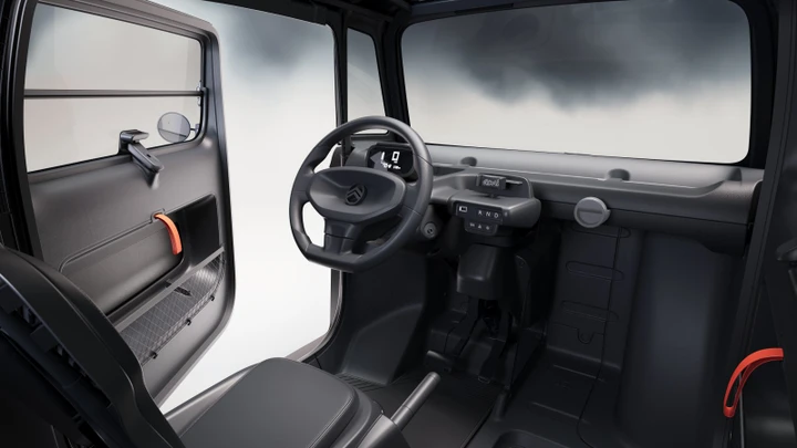 Citroen Ami Dark Side propone al posteriore pure un piccolo spoiler. La personalizzazione ha riguardato anche l’abitacolo della microcar francese. L’ambiente riprende gli elementi che sono presenti dell’Icy Pack e cioè tre vani portaoggetti sulla plancia, un gancio per borse davanti al sedile passeggero e reti portaoggetti grigie abbinate alle cuciture grigie dei tappetini. Al centro della plancia troviamo sempre un supporto per smartphone per trasformare il dispositivo mobile in una sorta di mini infotainment grazie all’app My Ami Play.
