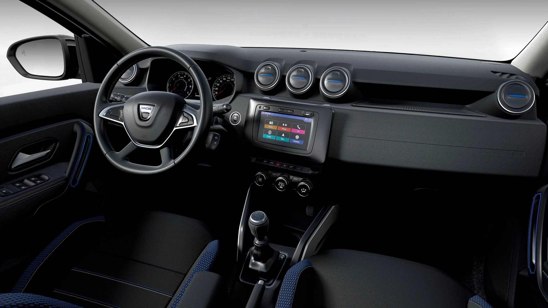 Internamente ci sono sellerie specifiche oltre ad elementi decorativi blu su bocchette, profili delle maniglie e tappetini anteriori e posteriori oltre al battitacco cromato, e ai dettagli cruscotto e plancia di colore blu. Questa Serie Speciale si basa sugli allestimenti Prestige per Duster (Qui la nostra prova) e Stepway per gli altri modelli della gamma. Tra le dotazioni di serie si menzionano retrocamera e sensori posteriori di parcheggio, climatizzatore automatico e Media NAV con touchscreen da 7 pollici, presa USB e Bluetooth.