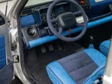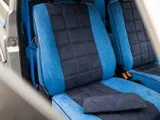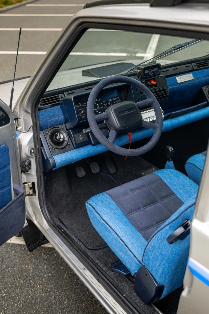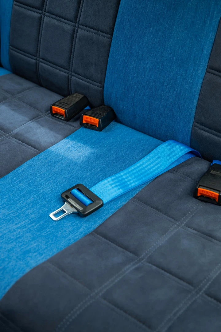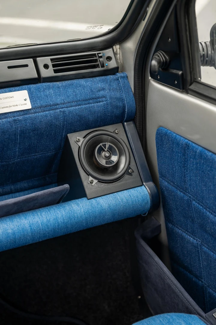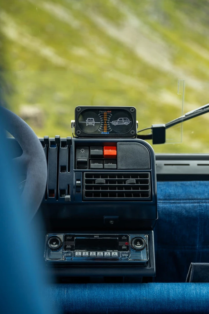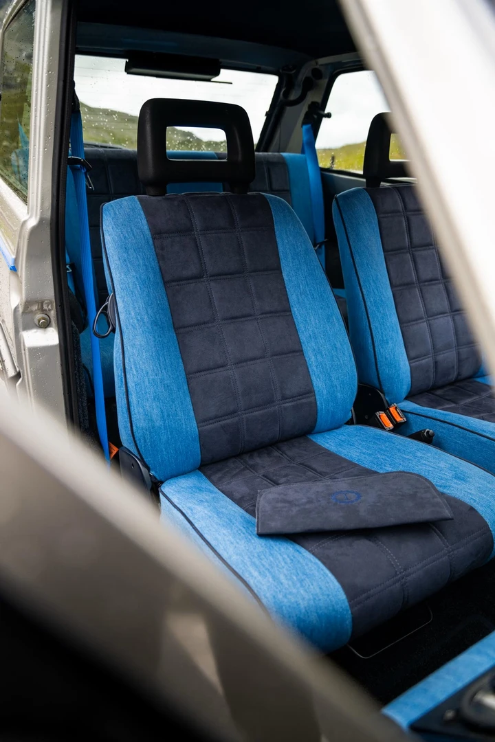 Anche l’abitacolo è stato personalizzato. L’esclusiva Pandenim offre interni rivestiti in denim, materiale scelto soprattutto per la sua resistenza. Più nello specifico, i sedili ed i pannelli porta sono rivestiti in denim trapuntato in due tonalità, chiaro e scuro, abbinato all’Alcantara blu che riveste volante, tasche laterali, cielo e cappelliera posteriore. Inoltre, cinture in blu elettrico, il cappuccio del cambio in denim azzurro e le plastiche della plancia verniciate in blu opaco. Tutti i dettagli sono stati realizzati su misura. Troviamo ad esempio battitacco incisi, targhette personalizzate, porta documenti in Alcantara con logo ricamato e un impianto audio studiato su misura per questa Panda 4×4, con un subwoofer posizionato sotto al sedile del conducente.
