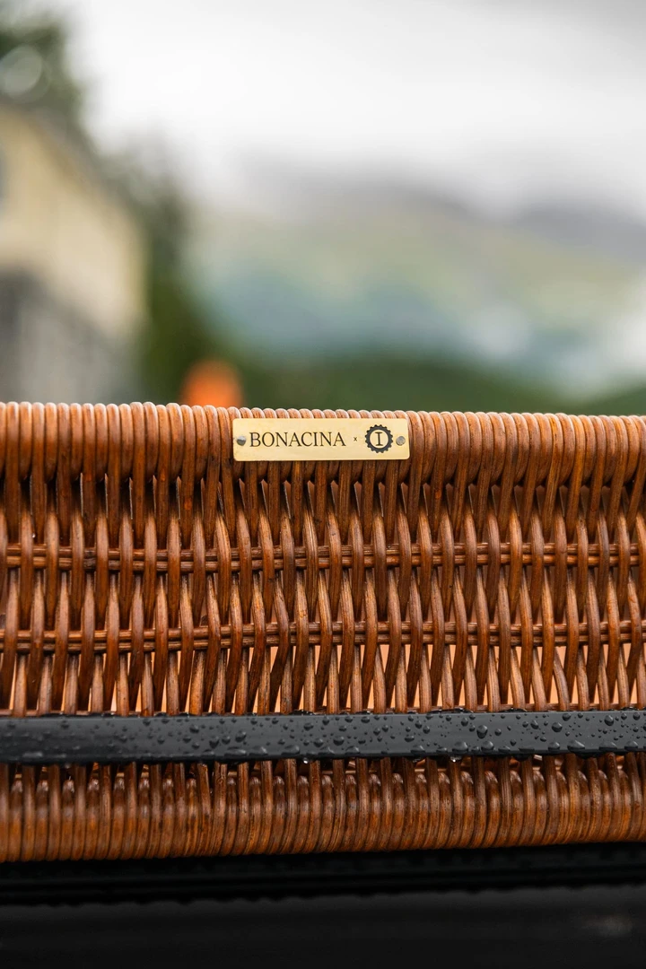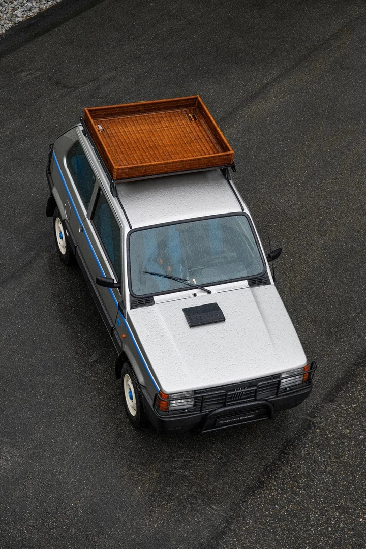 Sul tetto, è stata collocata una cesta in rattan Tabacco intrecciato a mano dagli artigiani di Bonacina per dare un tocco artigianale alla Panda 4×4.