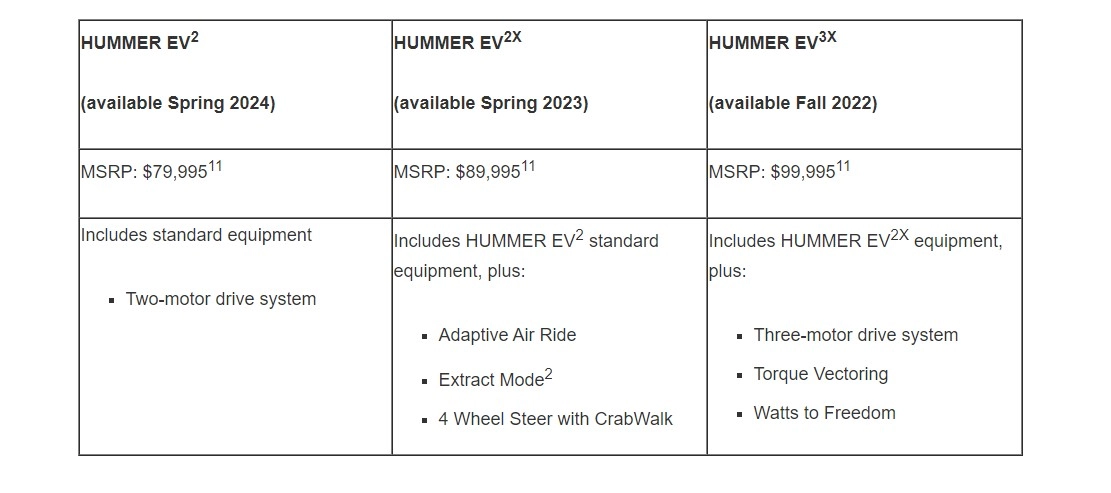 Parlando delle future versioni più "economiche", le specifiche saranno le seguenti. Hummer EV 3X che arriverà nell'autunno del 2022 a 99.995 dollari, disporrà di tre motori, ma avrà una potenza di 597 kW / 811 CV e 12.880 Nm di coppia. Anche l'autonomia scenderà a 300 miglia (483 km). Nella primavera del 2023,  debutterà la variante 2X per 89.995 dollari. È dotata di un doppio motore in grado di erogare 466 kW / 634 CV e 10.033 Nm di coppia. Questo modello sarà comunque in grado di percorrere più di 300 miglia (483 km) con una singola carica. Un anno dopo, nella primavera del 2024, la società lancerà il modello base a 79.995 dollari. Utilizzerà lo stesso powertrain nel modello 2X, ma avrà un'autonomia di 250 miglia (402 km).