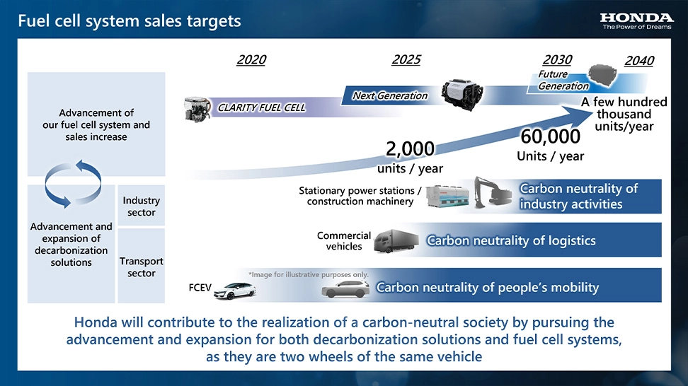 Parliamo, per esempio, di camion, macchine per le costruzioni e sistemi per la generazione di energia. Honda fa sul serio visto che ha dichiarato che punta a vendere 2.000 unità all'anno del suo sistema entro il 2025, per poi arrivare a commercializzarne 60.000 (sempre all'anno) entro il 2030. E nel lungo periodo, entro il 2040, il costruttore giapponese conta di arrivare a commercializzare diverse centinaia di migliaia di unità del suo sistema Fuel Cell ogni anno.