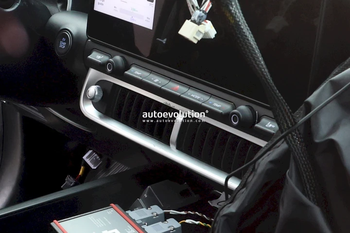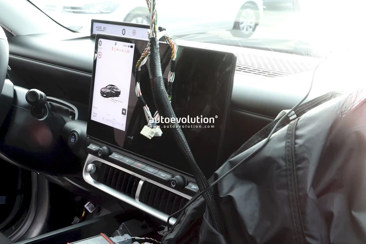 Le foto spia permettono di dare un’occhiata agli interni della nuova Hyundai IONIQ 3. Dietro al volante, ma in posizione rialzata sulla plancia è presente un piccolo display per la strumentazione digitale. Centralmente, invece, troviamo il display del nuovo sistema infotainment PLEOS che offre un’interfaccia grafica rivista. Al di sotto troviamo alcuni comandi fisici che permettono di gestire una serie di funzioni dell’auto.