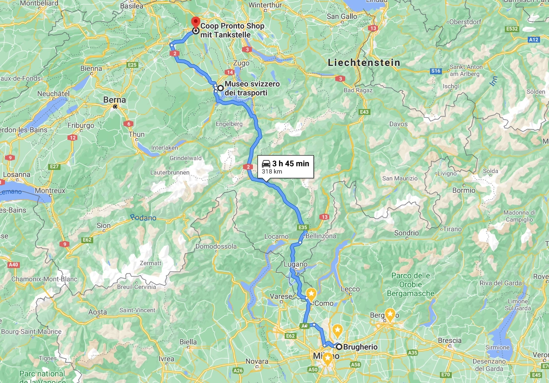 La scommessa – e anche l'unica possibilità che abbiamo se escludiamo il carro attrezzi – è quella di arrivare in Svizzera con una Nexo, fare tappa all'evento di consegna delle motrici Hyundai XCIENT con tecnologia Fuel Cell e proseguire verso il distributore. Il percorso previsto è questo: