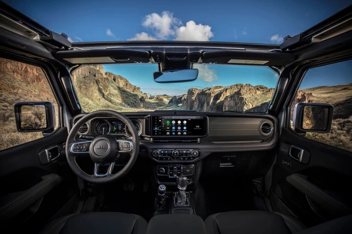 Jeep Wrangler presenta una plancia “verticale" tempestata di comandi, molto differente dagli interni minimalisti che vanno di moda oggi. La strumentazione è analogica, con un piccolo computer di bordo tra i due elementi circolari, ma non manca comunque la tecnologia dato che comunque centralmente sulla plancia troviamo il sistema infotainment Uconnect 5 da 12,3 pollici che offre anche la compatibilità con Amazon Alexa oltre che con Apple CarPlay e Android Auto.