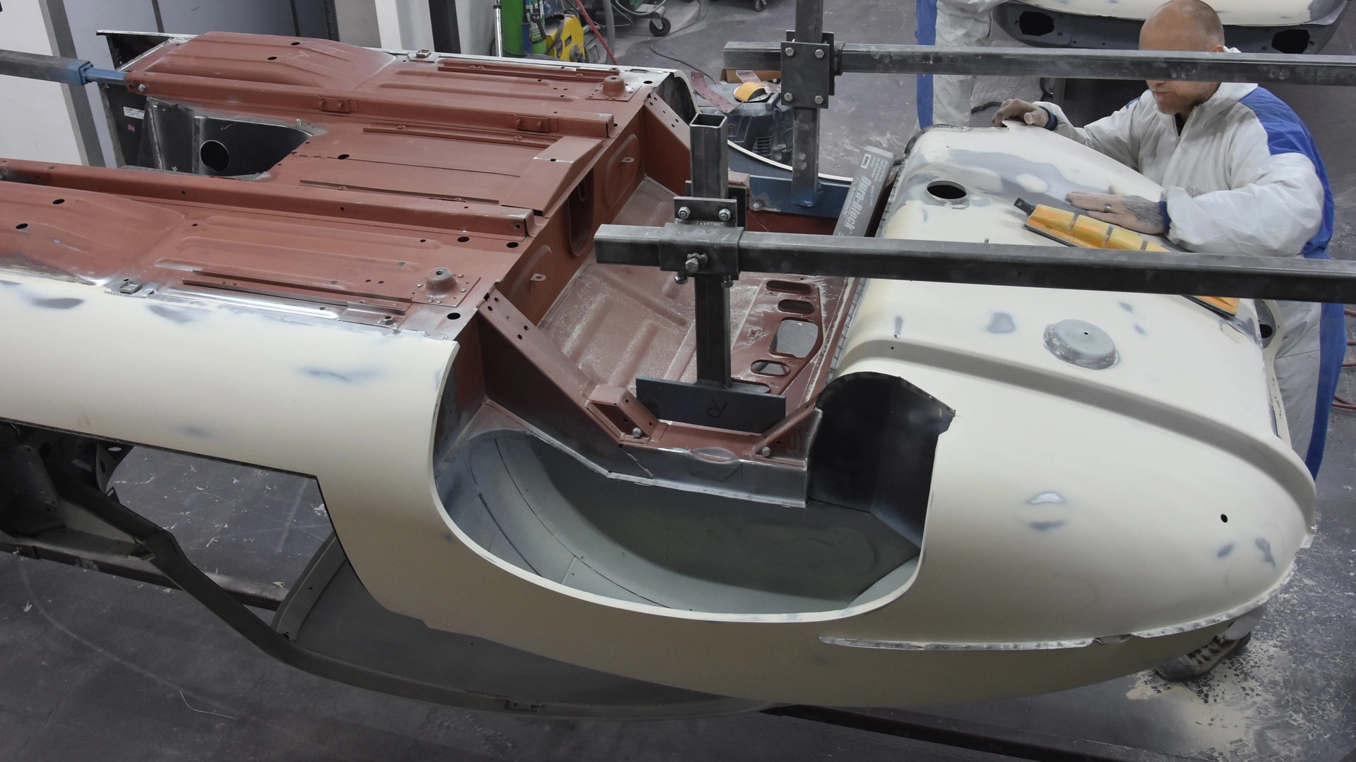 Tutto il telaio e la scocca in metallo hanno subito un processo di sabbiatura per rimuovere i resti di intemperie e ruggine degli ultimi 50 anni, con ogni singola parte smontata (pannelli porta, cofano, alettoni e splitter) che ha subito lo stesso trattamento in forma singola. Una volta rimontato il tutto, la Jaguar è stata poi ridipinta a mano col la suddetta colorazione Pearl Grey e ricoperta con diversi strati. Subito dopo è stata applicata con cura una vernice trasparente di alta qualità per preparare il corpo per la lucidatura finale.