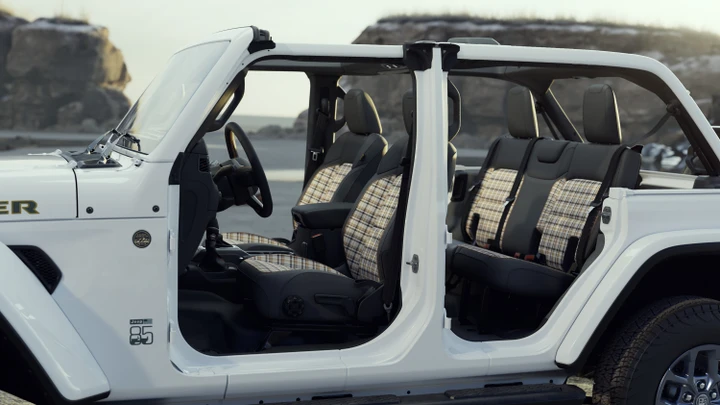 Questa serie speciale è basata sull’allestimento Sport S e presenta esterni esclusivi con ganci di traino in colore bronzo oltre a cerchi da 17 pollici verniciati in Steel Oxide. Gli acquirenti troveranno anche parafanghi in tinta con la carrozzeria, nonché badge e decalcomanie Blue Agave dedicati all’anniversario di Jeep. A tutto questo si aggiungono gruppi ottici a LED e finestrini posteriori oscurati. Ci sono novità e personalizzazioni anche per l’abitacolo. I sedili, ad esempio, dispongono di rivestimenti in tartan con la scritta “85th Anniversary“. Non mancano poi un impianto audio Alpine premium, sedili anteriori riscaldati, volante riscaldato e sistema keyless. C’è poi un completo pacchetto di sistemi ADAS che include anche il cruise contro adattivo.