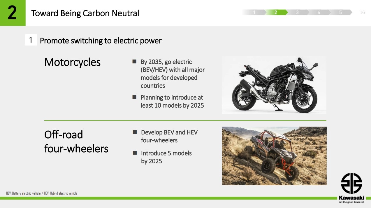 Inoltre, il costruttore ha svelato i piani per lo sviluppo di cinque nuovi veicoli a quattro ruote da fuoristrada alimentati da fonti di energia alternativa da realizzare nei prossimi anni. Il marchio sta anche continuando a lavorare su un prototipo di motore alimentato a idrogeno sviluppato sulla base del propulsore di Ninja H2.
