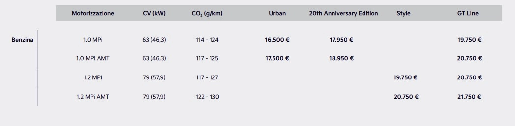 La versione Style, disponibile esclusivamente con la motorizzazione 1.2 MPi con cambio manuale o automatico, è offerta con la vernice Metallizzata inclusa nel prezzo, oltre a contenuti come il climatizzatore automatico, il wireless phone charger e la smart key di nuovo design. Abbiamo poi i sedili in pelle sintetica con finiture degli interni in materiale nero high glossy. Infine, la versione top di gamma GT-line include tutti i contenuti della versione Style e in più offre il design sportivo GT-line, i cerchi da 16 pollici GT-Line dedicati e la fascia luminosa centrale a LED. Per quanto riguarda gli interni è incluso il volante in pelle sportivo e la pedaliera in alluminio. Questa versione è disponibile con entrambe le motorizzazioni 1.0 MPi e 1.2 MPi.