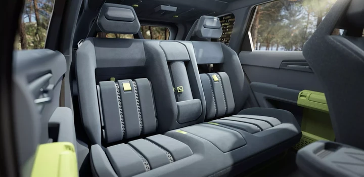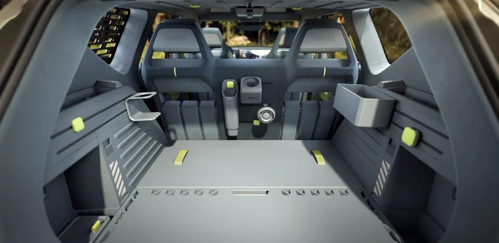 All’interno dell’abitacolo si trovano numerose soluzioni pratiche come i portaoggetti laterali e i sistemi a clip che ricordano l’approccio modulare del sistema YouClip lanciato da Dacia. Anche il cielo dell’abitacolo integra dei binari per fissare l’equipaggiamento, confermando la volontà di creare un ambiente pronto all’avventura ma ben organizzato.