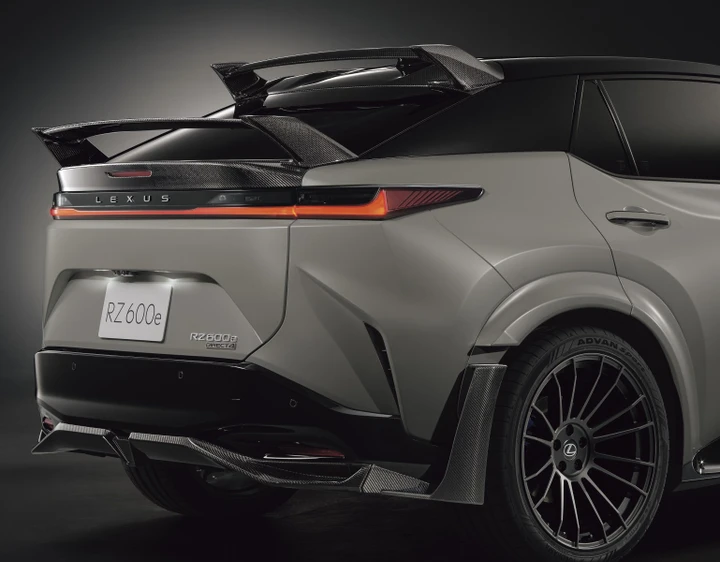 Questa serie speciale del SUV elettrico è basata sulla Lexus RZ 550e e si caratterizza per un body kit che rende il suo look molto più aggressivo, a partire dal doppio spoiler posteriore. Per migliorare la dinamica di guida, Lexus ha abbassato l’assetto di 20 mm. Gli esterni sono disponibili in due combinazioni di colori: Nero e HAKUGIN II con finitura opaca e Nero con Neutrino Gray. Inoltre, non mancano dettagli di colore blu a contrasto con il nero della carrozzeria. Per questa serie speciale, non mancano nemmeno diversi elementi realizzati in fibra di carbonio tra cui tetto e spoiler.