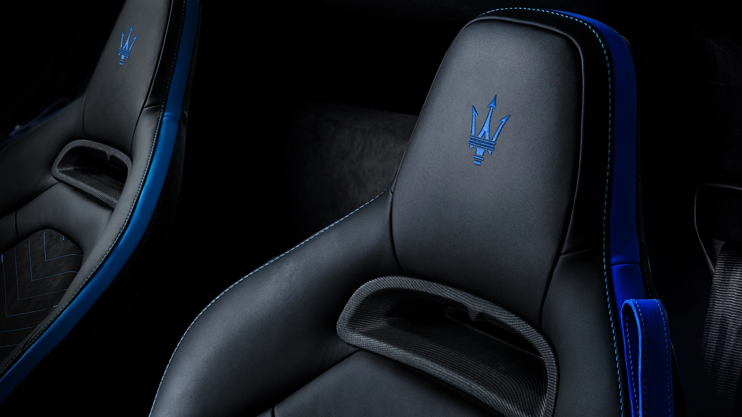 L'abitacolo è caratterizzato da forme semplici con pochi spigoli vivi. All'interno è presente anche tanta tecnologia. Due gli schermi, da 10 pollici: uno per il cockpit, l’altro per il Maserati Touch Control Plus. Nel tunnel centrale, coperto di fibra di carbonio, sono presenti: il caricabatteria wireless per smartphone, il selettore di modalità di guida (GT, Wet, Sport, Corsa e un quinto ESC Off che disattiva i controlli), due pulsanti per le marce, gli alzacristalli e  il comando del volume dell’infotainment. Inoltre, sotto il bracciolo compare un vano porta oggetti. Tutti gli altri comandi sono sul volante, con il tasto riservato all’accensione a sinistra e il launch control a destra.