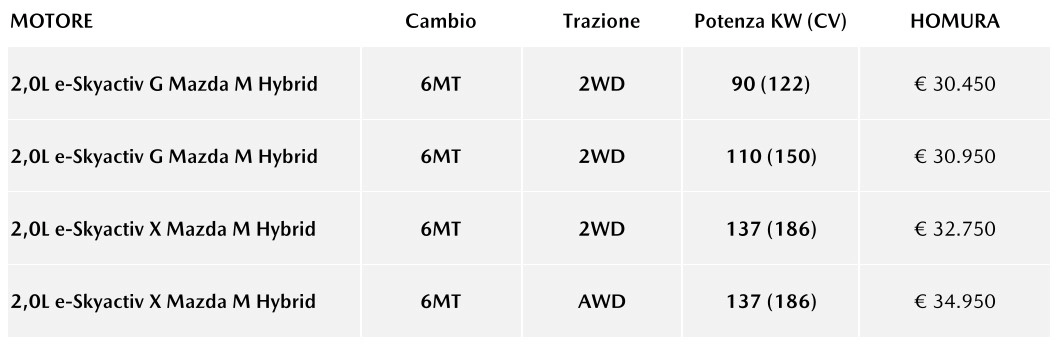 L'auto si può ordinare negli allestimenti Prime Line ed Exclusive Line oltre che nella versione speciale Homura. Più nel dettaglio, la versione Prime Line offre, tra le altre cose, i cerchi in lega da 16 pollici, i principali sistemi di assistenza alla guida, Head Up Display, fari a LED, videocamera posteriore, sistema infotainment con impianto audio a 6 altoparlanti e climatizzatore manuale.