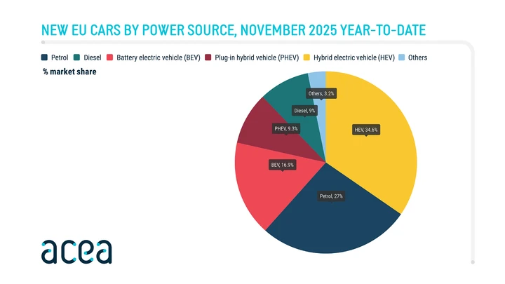 Nel mese di novembre le auto elettriche hanno fatto segnare 188.730 immatricolazioni in Unione Europea, pari ad una crescita del 44,1%. Nei primi undici mesi del 2025 , sono state immatricolate 1.662.399 nuove auto elettriche, che hanno conquistato il 16,9% della quota di mercato dell’UE. I quattro mercati più grandi dell’UE, che insieme rappresentano il 62% delle immatricolazioni delle BEV, hanno registrato questi incrementi: Germania (+41,3%), Belgio (+10,2%), Paesi Bassi (+8,8%) e Francia (+9,1%). Passiamo alle ibride che continuano a mostrare un segno positivo con 301.81 (+4,2%) immatricolazioni in Unione Europea a novembre. I dati da gennaio a novembre 2025 hanno inoltre mostrato un aumento delle immatricolazioni di nuove auto ibride nell’UE, che hanno raggiunto le 3.408.907 unità, trainate dalla crescita nei quattro mercati principali: Spagna (+26%), Francia (+24,2%), Germania (+8,7%) e Italia (+7,9%). I modelli ibridi rappresentano il 34,6% del mercato totale dell’UE.