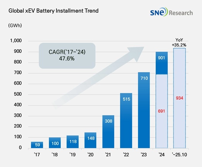 Nei primi dieci mesi del 2025 l’energia installata nei veicoli elettrici ha superato i 933 GWh.
